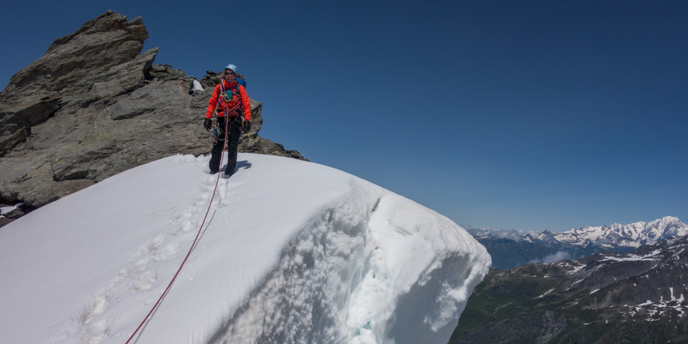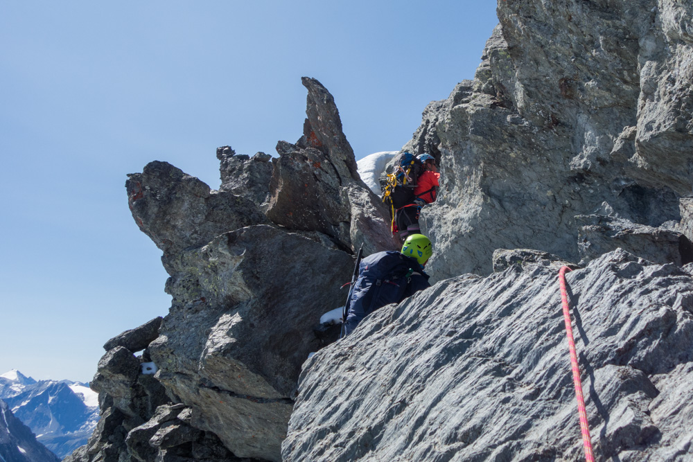 Nous avons ensuite longé l’arête vers les Sud Ouest (Grand Bec/Pointe du Vallonnet) d’abord en neige puis en rocher.